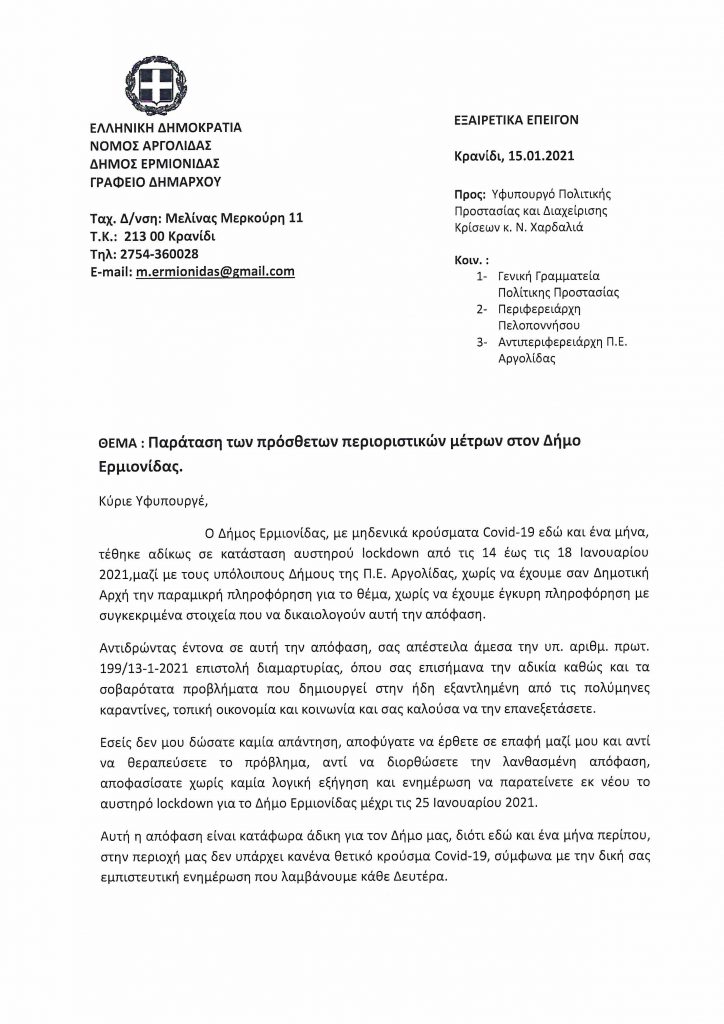 Όπως γνωρίζετε μια τέτοια απόφαση δημιουργεί σοβαρά προβλήματα στην τοπική Οικονομία και στην τοπική Κοινωνία, γι’ αυτό παρακαλούμε να επανεξετάσετε την απόφασή σας κατά το μέρος που αφορά τον Δήμο Ερμιονίδας.