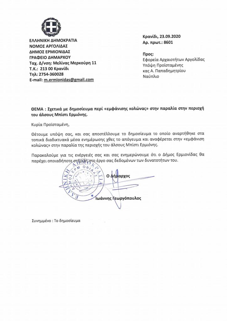 Έπειτα από δημοσίευμα που αναρτήθηκε χθες το απόγευμα σε τοπικά διαδικτυακά μέσα ενημέρωσης, σχετικά με αρχαιολογικό εύρημα «στήλη – βάση πιθανώς αγάλματος» σε παραλία στην περιοχή του άλσους Μπίστι Ερμιόνης, απεστάλη επιστολή προς την Εφορεία Αρχαιοτήτων Αργολίδας, στην οποία ζητείται η άμεση παρέμβαση της αρμόδιας Υπηρεσίας και δηλώνεται η αμέριστη στήριξη του Δήμου Ερμιονίδας στο πλαίσιο των δυνατοτήτων του.