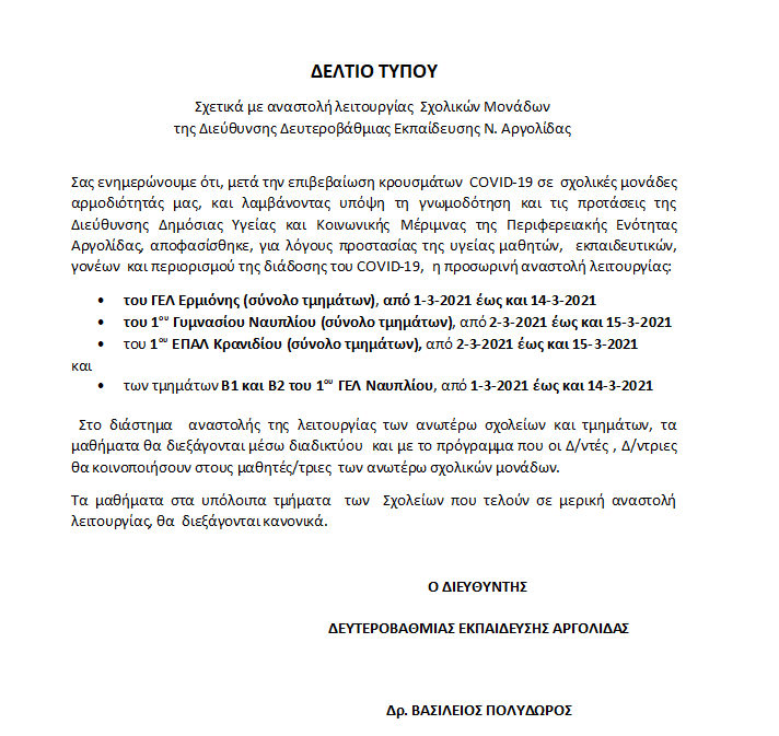 Σας ενημερώνουμε ότι σύμφωνα με την με Αριθμ.Δ1α/ΓΠ.οικ.: 13805/3.3.2021 Κ.Υ.Α. “Έκτακτα μέτρα προστασίας της δημόσιας υγείας από τον κίνδυνο περαιτέρω διασποράς του κορωνοϊου COVID-19 στο σύνολο της Επικράτειας για το διάστημα από την Πέμπτη, 4 Μαρτίου 2021 και ώρα 6:00 έως και την Τρίτη, 16 Μαρτίου 2021 και ώρα 6:00’’ που δημοσιεύτηκε στο τεύχος Β΄ της Εφημερίδας της Κυβερνήσεως με αριθμό φύλλου 843 στις 3.3.2021 ισχύουν τα εξής: