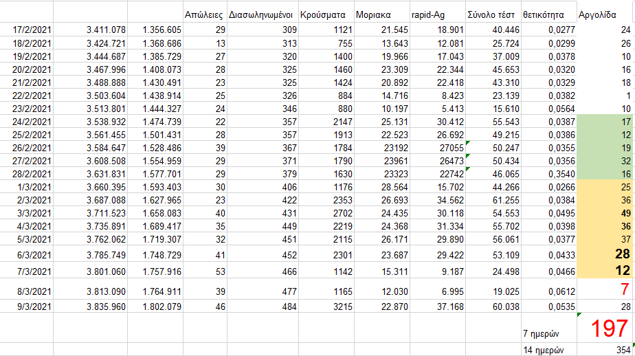 Εξ άλλου, μέχρι και σήμερα Πέμπτη 11 Μαρτίου, στα νοσοκομεία covid-19 της Περιφέρειας νοσηλεύονταν συνολικά 152 άτομα (τα 10 σε ΜΕΘ) και συγκεκριμένα, στο Νοσοκομείο Αργους 17, στο Νοσοκομείο Ναυπλίου 24, Παναρκαδικό Τρίπολης 31, στο Νοσοκομείο Κορίνθου 47 (τα 6 σε ΜΕΘ), στο Νοσοκομείο Σπάρτης 9 και στο Νοσοκομείο Καλαμάτας 24 (4 σε ΜΕΘ).