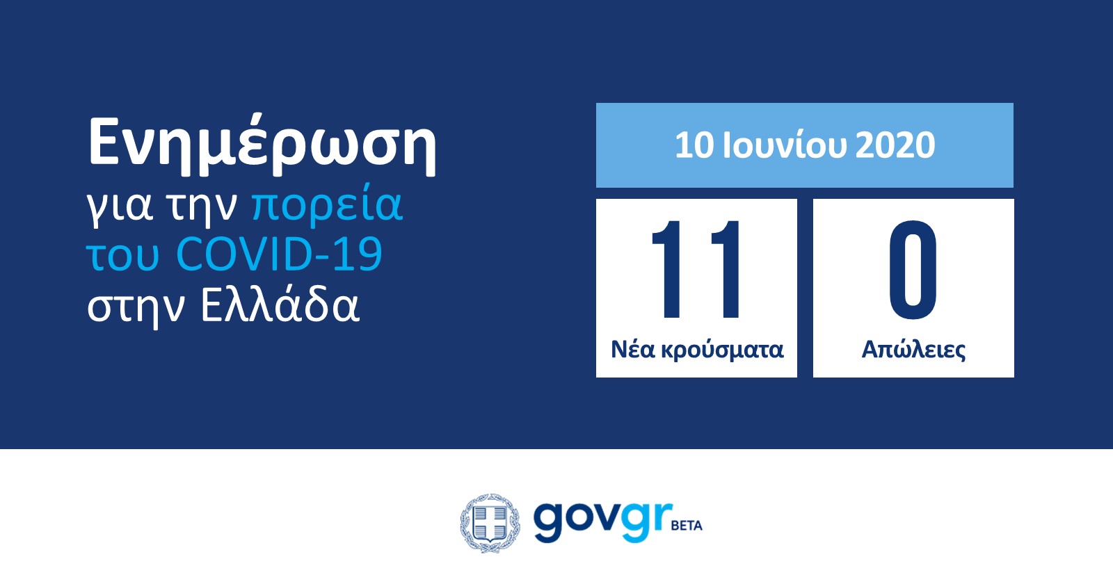 Ανακοινώνουμε 11 νέα κρούσματα και κανένα θάνατο. Ο συνολικός αριθμός των κρουσμάτων ανέρχεται σε 3.068 και των θυμάτων σε 183.