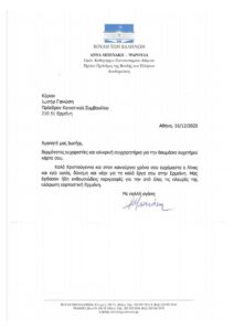 Στην Χριστουγεννιάτικη Κάρτα της Ιεράς Μητρόπολης Ύδρας , Σπετσών Αιγίνης, Τροιζηνίας και Ερμιονίδας … με τις ιδιαίτερες χειρόγραφες υποσημειώσεις του Σεβασμιωτάτου κ .κ. Εφραίμ , την ευχετήρια κάρτα του Δήμου Ερμιονίδας την ευχετήρια κάρτα του Αστυνομικού Τμήματος Ερμιονίδας, μετά από εθιμοτυπική επίσκεψη του Διοικητή του στο γραφείο μας, την ευχετήρια κάρτα του Λαογραφικού Κέντρου Κρανιδίου, την ευχετήρια κάρτα των εκπαιδευτηρίων … “ΠΑΙΔΑΓΩΓΙΚΉ- BIRDS”, την ευχετήρια κάρτα του φιλόπτωχου ταμείου Άγιος Ιωάννης ο Eλεήμων, την προσωπική αφιέρωση στο ημερολόγιο της Αθλητικής ένωσης Ερμιονίδας του Προέδρου της κ. Βλαχoγιάννη Παντελή την συγχαρητήρια επιστολή της αξιότιμης Προέδρου Ακαδημίας Αθηνών και πρώην Προέδρου της Βουλής των Ελλήνων Άννας Ψαρούδα- Μπενάκη που αναδημοσιεύουμε