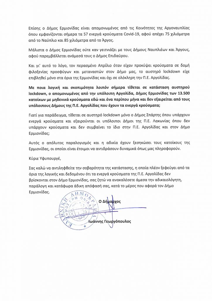 O Δήμαρχος Ερμιονίδας ζητα εκ νέου την ανάκληση των περιοριστικών μέτρων για την Ερμιονίδα.